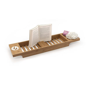 A bamboo bath tray with book/tablet rest, incense cones and ceramic dish for the ultimate relaxing bath. 75cm x 20cm x 8cm.