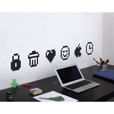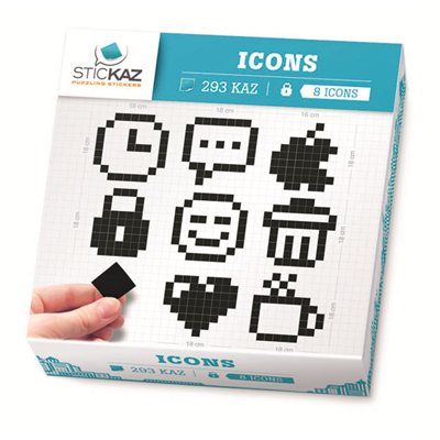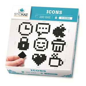 Stickaz is a new decoration concept, inspired by pixel art and puzzles. We offer boxes with small square stickers inside that you stick one by one, like a puzzle, to reveal the desired visual. Each model comes with a manual and setup instructions. At Stickaz, a pixel is called a Kaz, a one colour 2cm x 2cm thin mat square sticker that exists in 40 different colours. The Kaz are made out of a high quality, waterproof vinyl. They are easily removable and won't leave any marks at all, even after years. Icons contains 293 Kaz.