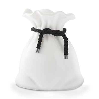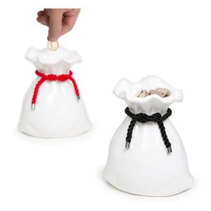 Money box? Money bag is the way forward! A ceramic money bag standing upright waiting to be filled, Loot is designed without the use of a bung to hold the money in. when you need to access your cash simply pour it out!. Available in White with Black or Red Tie