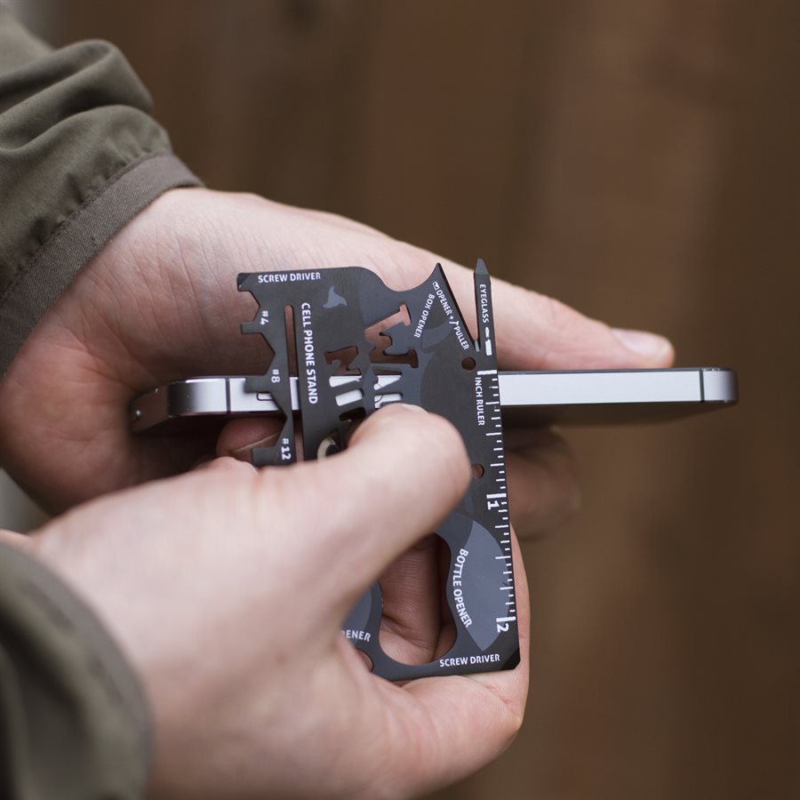 Outfit any wallet with 18 useful, everyday tools with the Wallet Ninja. This perfectly flat multi-tool packs six wrenches, four screwdrivers, two rulers, a cellphone stand, a bottle opener, a can opener, a letter opener, a box cutter, and a fruit peeler into a single piece of steel the size of a credit card. Made from 4X heat-treated steel, Wallet Ninja is thinner than two credit cards and will fit into any wallet.